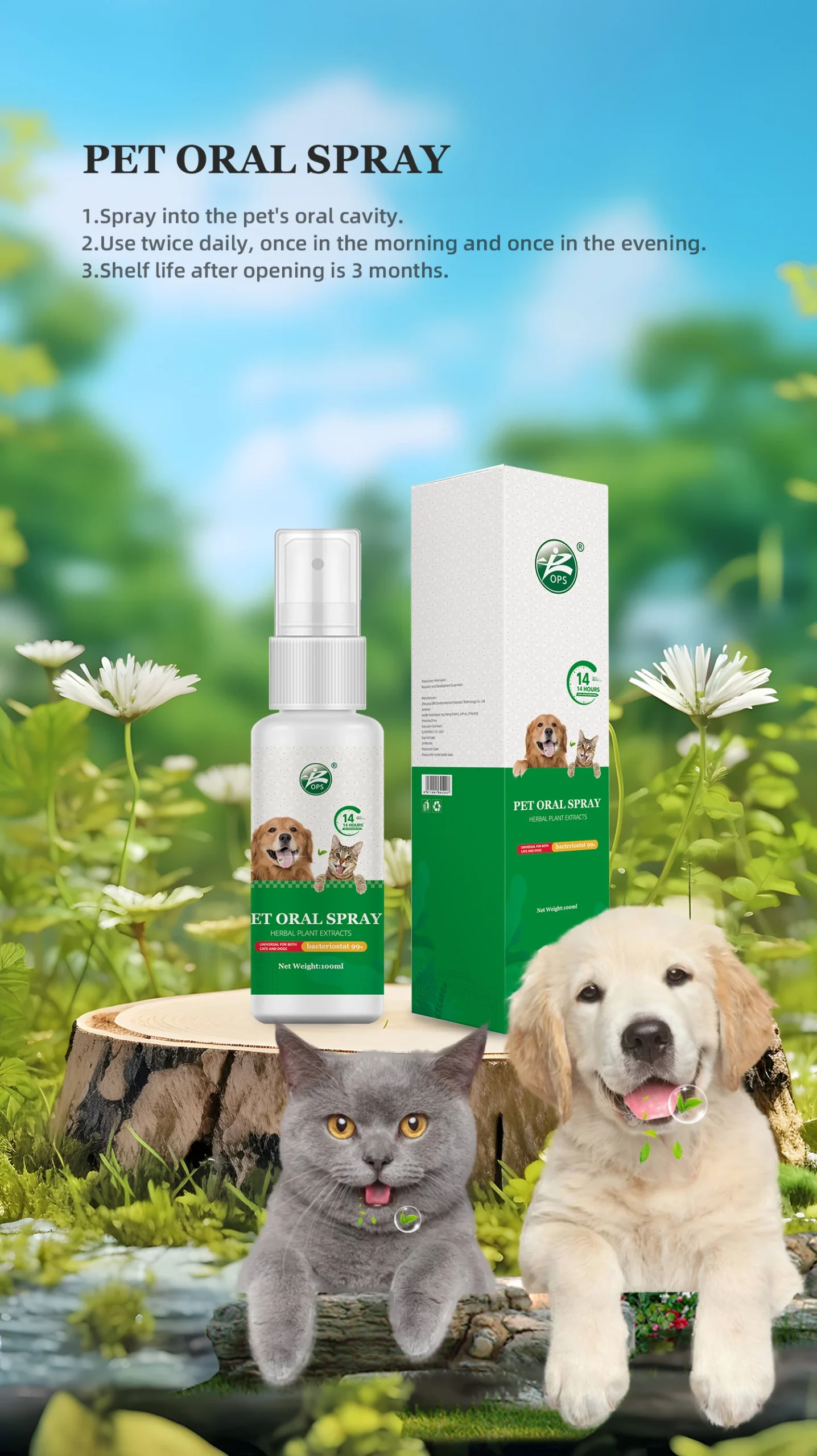 The pet oral spray is formulated to kill and inhibit bacteria in the oral cavity of pets.